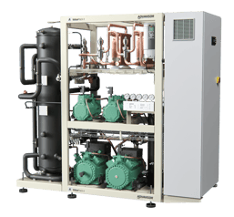Vi har kombineret fleksibiliteten fra mindre løsninger og styrken fra industrielle løsninger: Mød CuBig II. Den kombinerer køl, frys, aircondition og varme i ét system og leverer op til 450 kW køling og 600 kW varme med et lille fodaftryk.